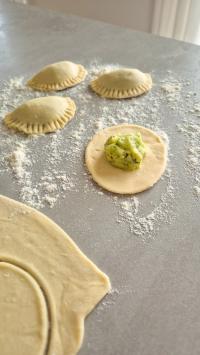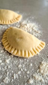 - Den Teig auf einer leicht bemehlten Arbeitsfläche dünn ausrollen. Mit einem Glas oder einer runden Ausstechform Kreise mit einem Durchmesser von ca. 8–9 cm ausstechen. Jeden Teigkreis mit 1–2 TL der Füllung belegen. Den Rand leicht mit Wasser befeuchten, den Kreis in der Mitte zusammenklappen und die Ränder fest zusammendrücken. Mit einer Gabel zusätzlich versiegeln. Die Pierogi können nun entweder eingefroren oder direkt weiterverarbeitet werden.