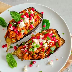 - Die Auberginenschiffchen nun großzügig mit der Bulgurmasse befüllen. Den Hirtenkäse darüber zerbröseln und mit Granatapfel und Minze garnieren.