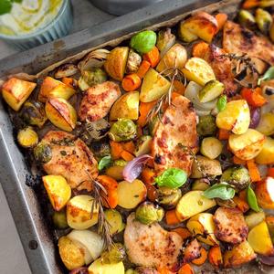 - Im Ofen ca. 30 Minuten garen, bis das Hähnchen zart ist und das Gemüse innen weich und außen leicht gebräunt ist. Dazu passt hervorragend ein Dip wie Tzatziki.