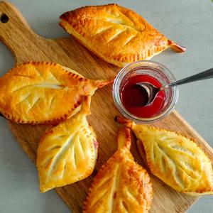 - Pro Paar ein Rechteck mit etwas geriebenen Mozzarella und 1-2 TL Marmelade befüllen. Das andere Rechteck darüberlegen, die Ränder aneinanderdrücken und eine Blattform daraus schneiden. Die Ränder mit einer Gabel fixieren und mit einem Messer ein Blattmuster auf das Blatt einschneiden. Jedes Blatt nun auf ein mit Backpapier ausgelegtes Backblech legen.