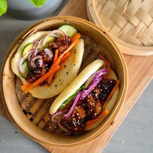 - Bao Buns dämpfen:Einen Bambusdämpfer (oder Dampfgarer) über siedendem Wasser platzieren. Die Bao Buns portionsweise 10 Minuten dämpfen, bis sie schön fluffig sind.