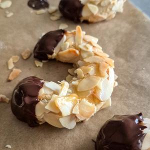 Die Kuvertüre fein hacken und über einem Wasserbad schmelzen. Die Enden der Mandelhörnchen in die flüssige Schokolade tauchen und auf einem Gitter vollständig trocknen lassen.