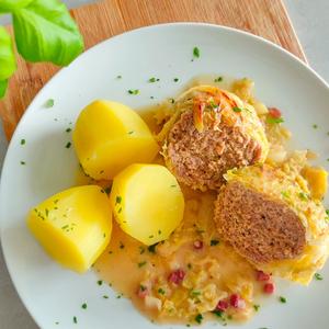 - Die Kohlrouladen zurück in den Topf geben. Ca 45 min abgedeckt köcheln lassen. Die Soße anschließend mit Salz und Pfeffer abschmecken und bei Bedarf mit Stärke (in etwas Wasser aufgelöst) andicken. Zu Salzkartoffeln servieren.