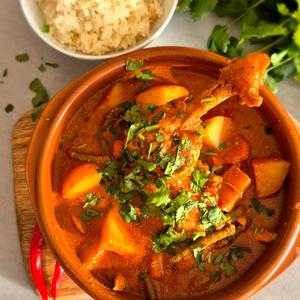 - Kartoffeln und Karotten schälen, würfeln und in den Topf mit der Hühnerbrühe geben. Die beiden Saucen aus dem Mixer ebenfalls in die Brühe einrühren. Etwas gehackten Koriander hinzufügen und alles etwa 15 Minuten köcheln lassen, bis das Gemüse weich ist. Danach das Hähnchenfleisch und die grünen Bohnen hinzufügen und weitere 5 Minuten köcheln lassen. Mit Reis servieren und mit frischem Koriander garnieren.