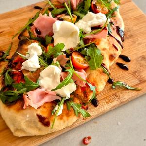 - Mediterran: Tomatensauce, Mozzarella, Prosciutto Crudo, Rucola, Cherrytomaten, Burrata