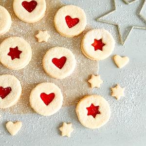 - Das Gelee glatt rühren und auf die heißen Plätzchen streichen, die keine Löcher haben. Ein Plätzchen mit Loch drauflegen, leicht andrücken und vollständig abkühlen lassen. Mit Puderzucker bestäuben (optional).